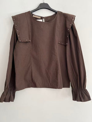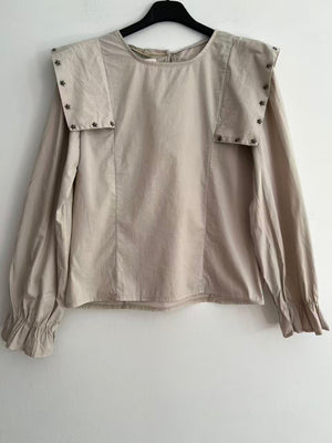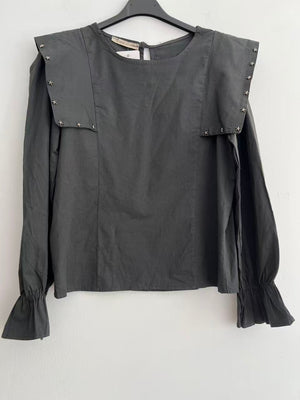 Esta elegante blusa es una prenda esencial de ropa mujer para quienes buscan un estilo sofisticado y moderno. Destaca por su cuello decorado con pequeños adornos metálicos en forma de estrellas, un detalle original que aporta un toque de distinción y brillo al conjunto.