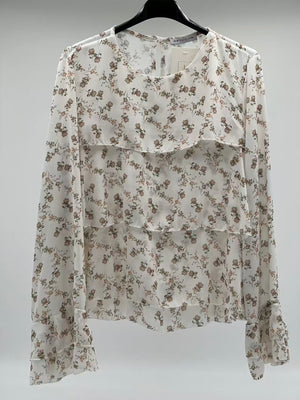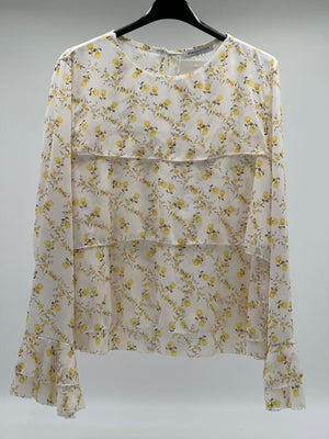 Esta blusa de gasa es la personificación de la feminidad. Con un delicado estampado floral en tonos amarillos y ocres, esta prenda destaca por su diseño de volantes en capas que aportan movimiento y volumen de una forma muy sofisticada.