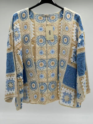 Este cárdigan es una verdadera joya para tu armario de primavera. Confeccionada íntegramente en 100% algodón natural, esta prenda destaca por su exquisito trabajo de ganchillo que combina rosetones florales y patrones geométricos en una armoniosa paleta de amarillo vibrante, azul cielo y tonos tierra neutros.