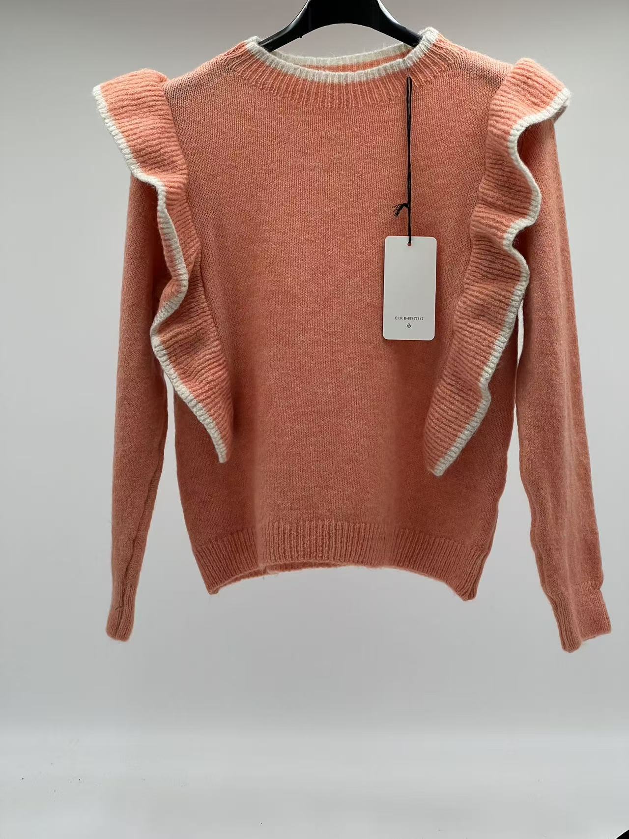 Descubre nuestro jersey de lana, una prenda esencial dentro de la categoría ropa mujer para esta temporada. Diseñado con mangas largas y delicados volantes en los laterales, aporta un toque femenino y elegante a cualquier conjunto diario.